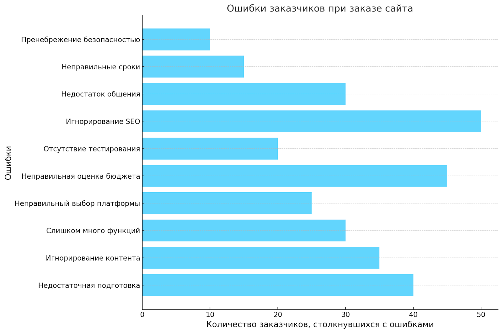 • Неизвестная целевая аудитория: Без анализа своей аудитории заказчик рискует создать сайт, который не будет удовлетворять потребностям потенциальных клиентов.